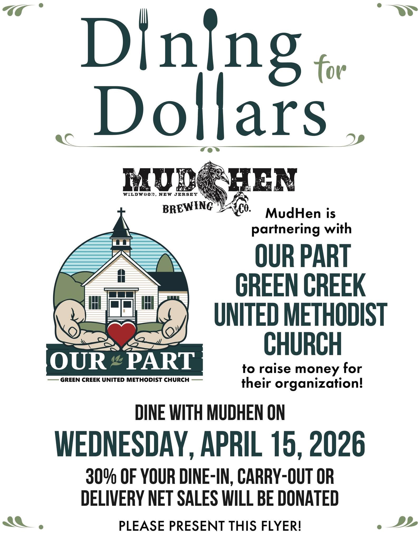 Dine with MudHen Brewing Company on Wednesday, April 15, 2026 to raise money for Our Part Green Creek United Methodist Church.